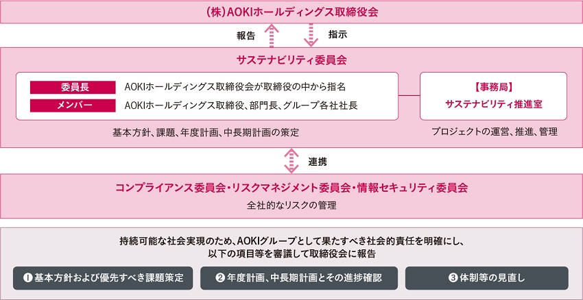 2021年12月、AOKIホールディングス取締役、部門長、グループ各社社長からなるサステナビリティ委員会を設置しました。同委員会は原則年2回開催し、気候変動が事業に与えるリスク・機会の評価を行うとともに、グループ全体の持続的成長に向けた年度計画および中長期計画について審議し、取締役会に報告しています。